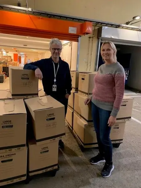 Per Kristian Ottersland fra Riksarkivet tok i mot flytteeskene med arkivmateriale fra Franzefoss. Bergindustriarkivet, her ved Petra Erdösi, stod for transporten. Foto: Norsk bergindustriarkiv