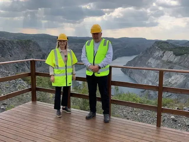 Anita Kurthi og Jan Erik Nilsen fra Sydvaranger Drift AS ved utsiktspunktet ved Bjørnevatn gruve. (Foto: Ingrid Nøstberg)